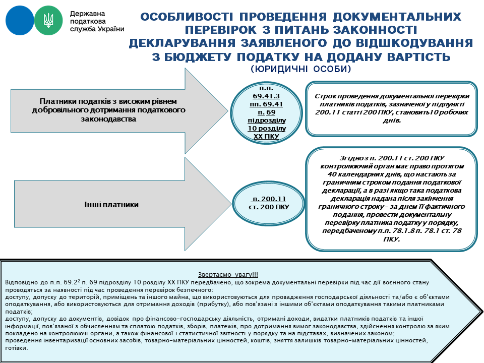 Проведення документальних перевірок щодо законності декларування заявленого до бюджетного відшкодування податку на додану вартість (ПДВ) для юридичних осіб здійснюється у такі строки: