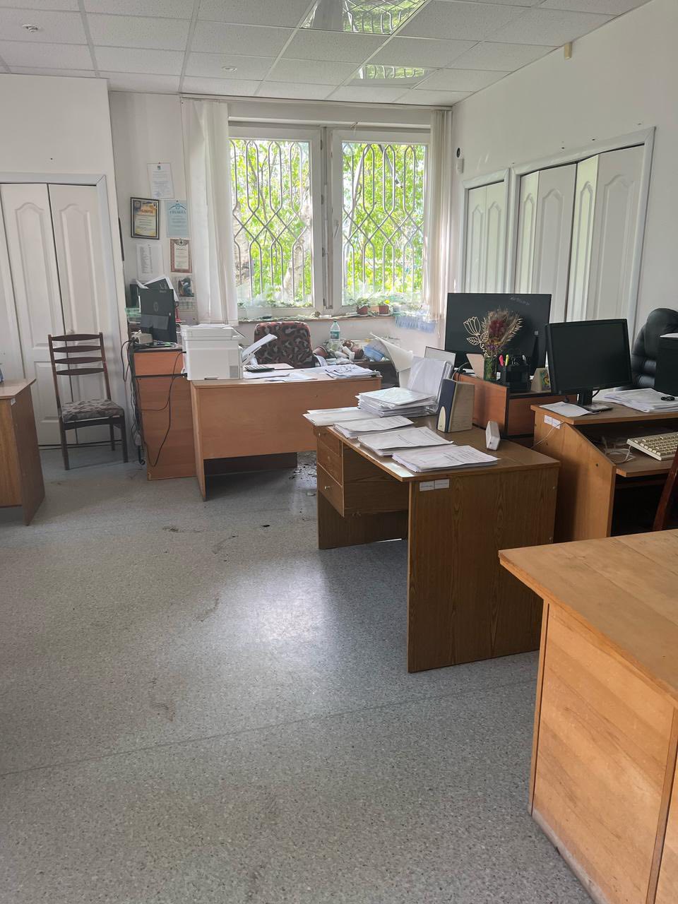 There are significant damage to the facade and roof, broken windows in the Inspectorate.