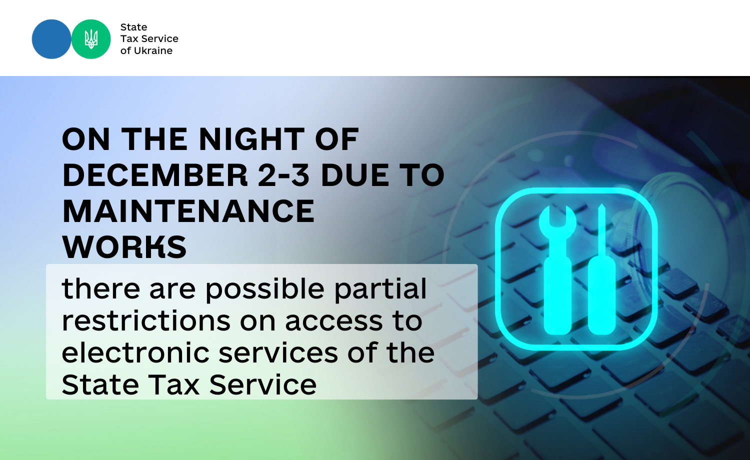 Due to maintenance works of the software and hardware complex of the Qualified Provider of Electronic Trust Services of the State Tax Service of Ukraine from 23:00 on 02.12.2025 to 01:00 on 03.12.2025, partial restrictions on access to its electronic services are possible.