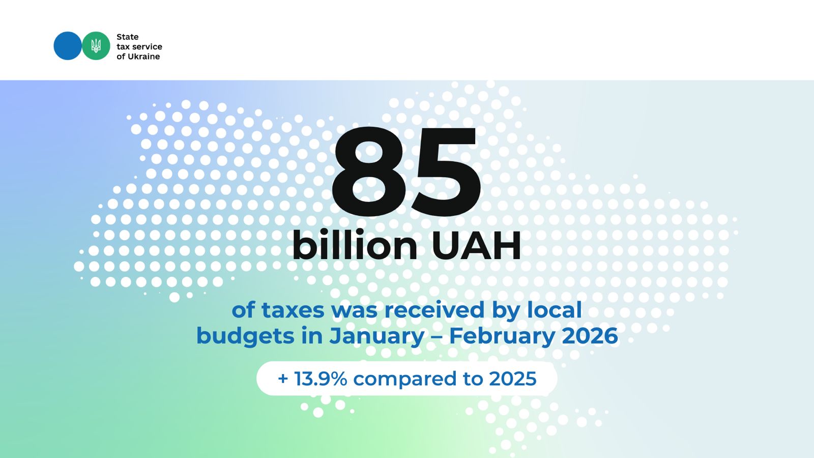 In two months of 2026, local budgets received more than 85 billion UAH of taxes. Compared to January – February 2025, revenues increased by 13.9% more than in the same period last year. This was informed by acting Head of the State Tax Service Lesya Karnaukh on the Facebook page.