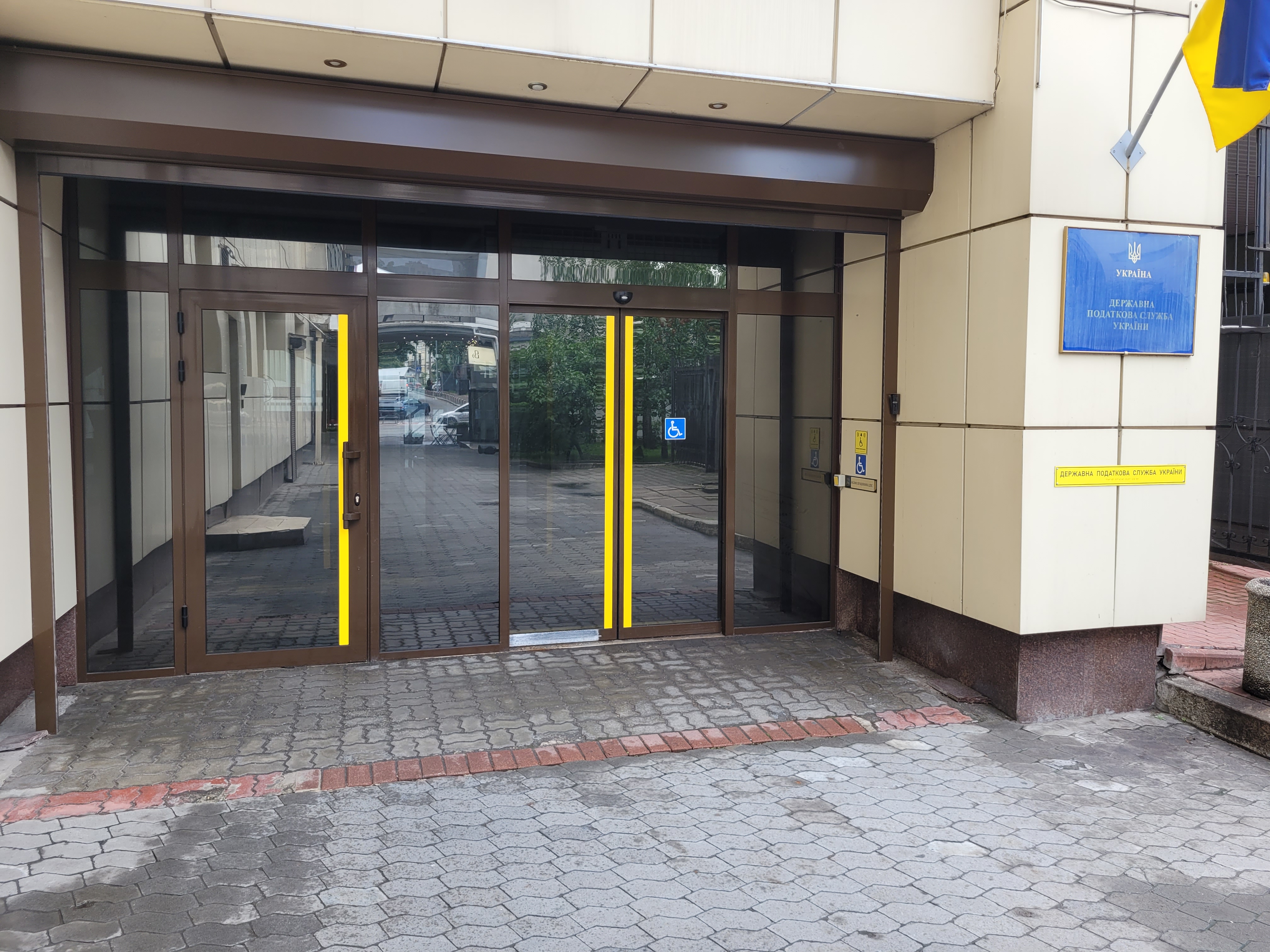 Встановлення тактильних та візуальних елементів доступності забезпечено в адміністративній будівлі апарату ДПС за адресою: м. Київ, Львівська площа, 8.