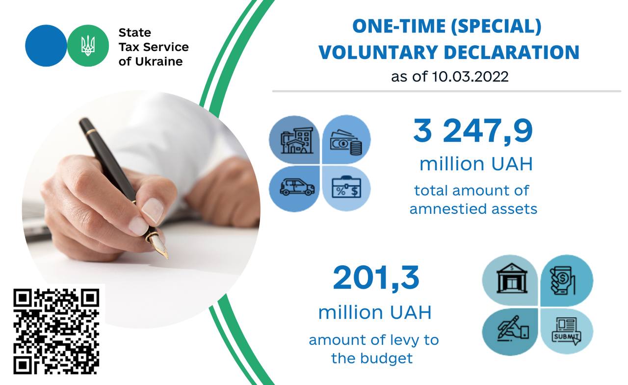 State Tax Service of Ukraine informs that 3247.9 million UAH has been declared since the beginning of one-time (special) voluntary declaration campaign of individuals’ assets.