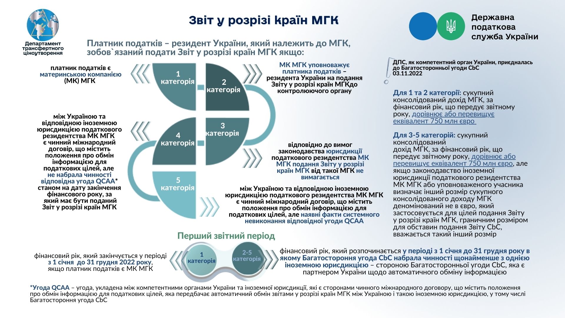 - between Ukraine and the corresponding foreign jurisdiction of the parent’s company tax residency of the international groups of companies, there is a valid international agreement containing provisions on the information exchange for tax purposes, but the corresponding QCAA agreement has not entered into force (Sub-paragraph 14.1.103 Paragraph 14.1 Article 14 Section I of the TCU) as of the date an end of financial year for which Report by country of the international group of companies should be submitted;
