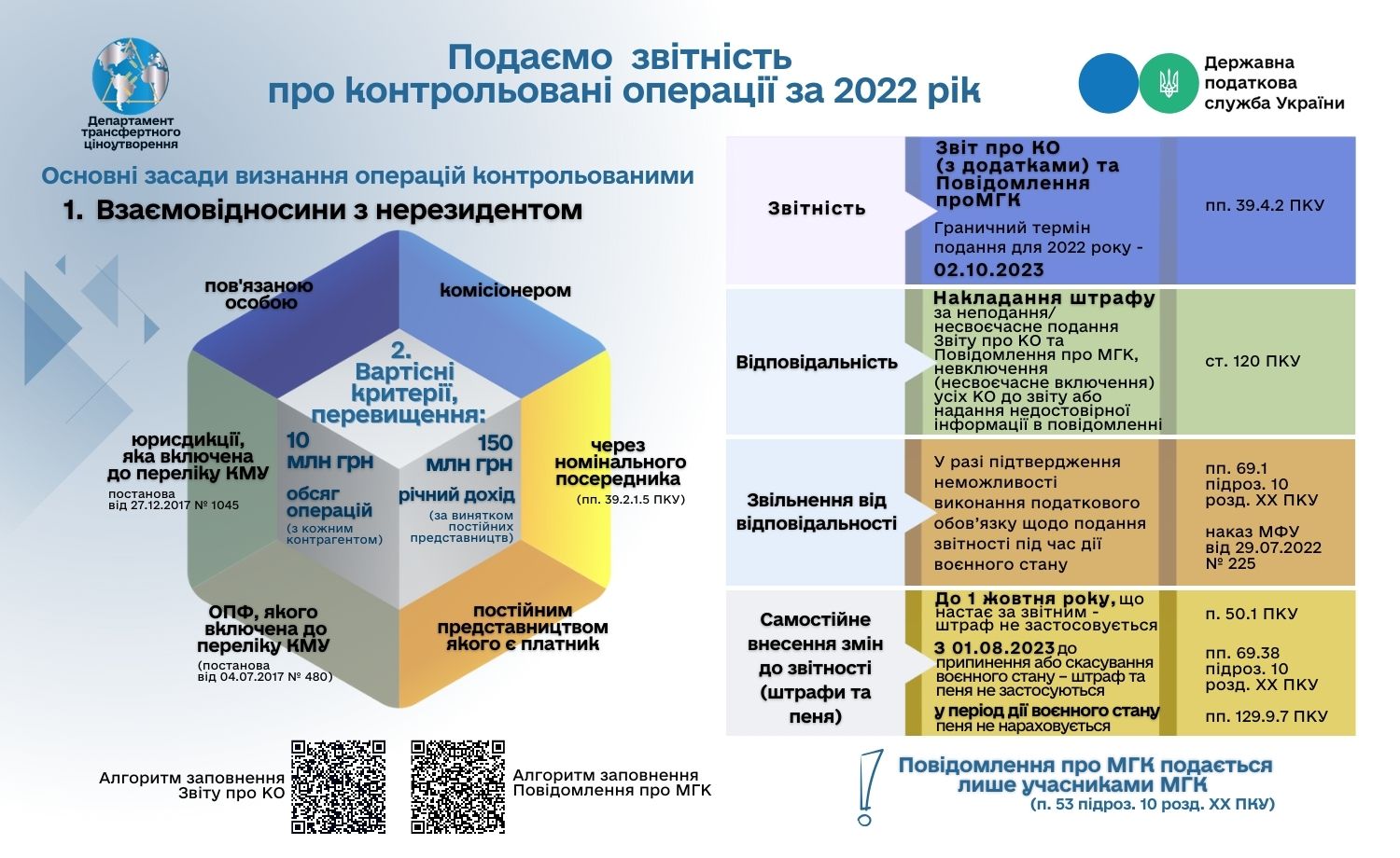 State Tax Service of Ukraine reminds that deadline for taxpayers to submit reports on controlled operations (hereinafter – Report) and Notification on participation in the international group of companies (hereinafter – Notification), which are separate reporting forms for tax control over transfer pricing, is coming up.