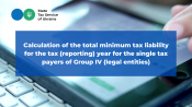 It also should be noted that in case of transition of the single tax payer of Group IV from general or simplified taxation system (single tax of Group III) in 2023, annex with Calculation, which contains calculation of amount of the minimum tax liability, is submitted to the income tax declaration or the single tax payer declaration of Group III (legal entities) or the single tax payer declaration of Group III for a period of the martial law, state of emergency in Ukraine. However, annex with Calculation is also submitted to the single tax payer declaration of Group IV, but indicators are not filled in.