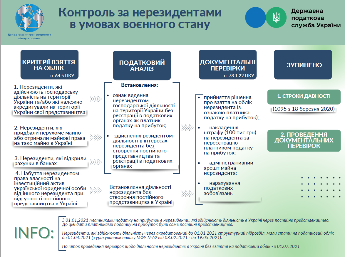 Державна податкова служба України для забезпечення взаємодії з платниками податків інформує про особливості здійснення контролю за нерезидентами (представництвами нерезидентів) у зв’язку із запровадженням воєнного стану в Україні.